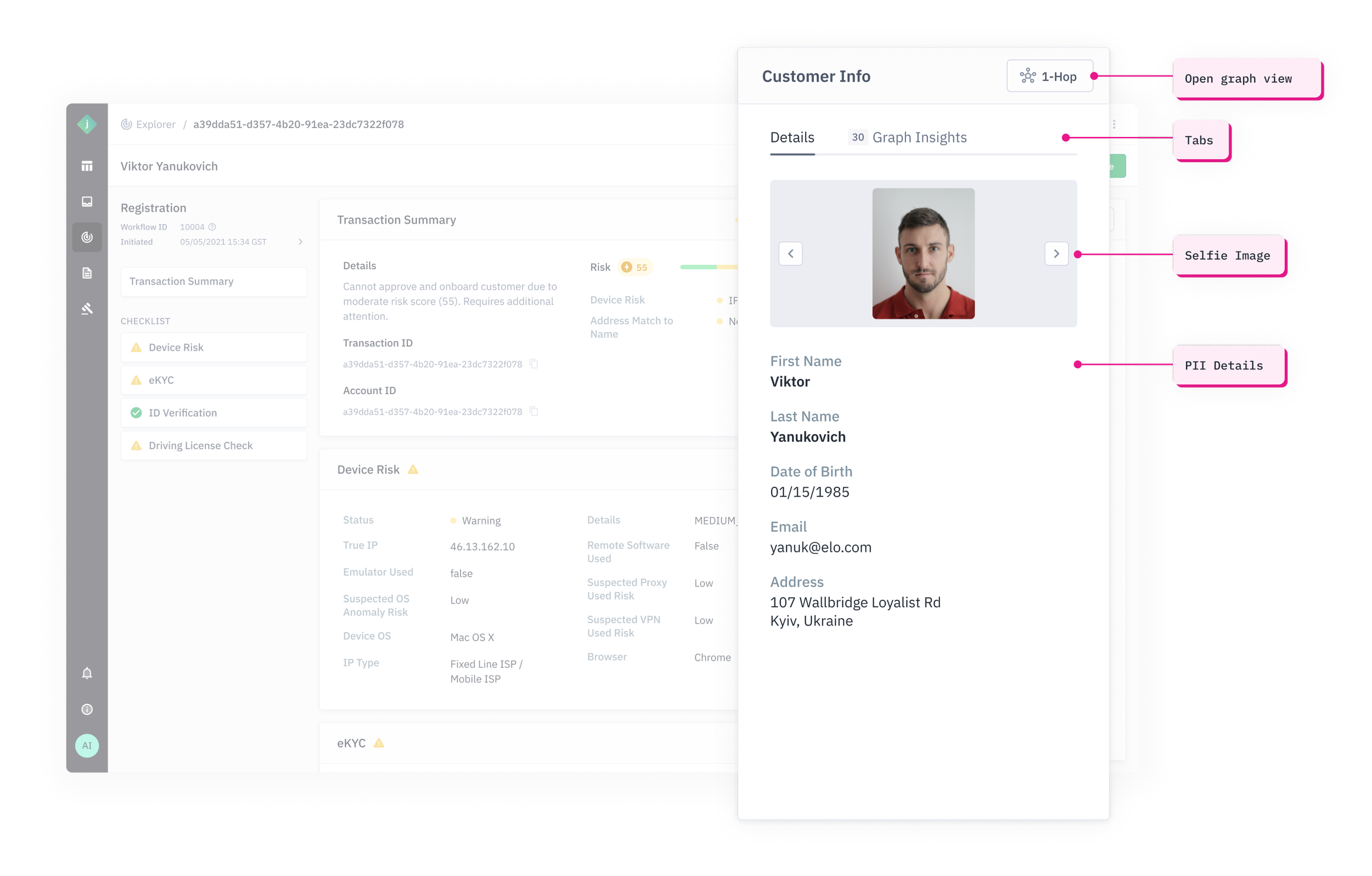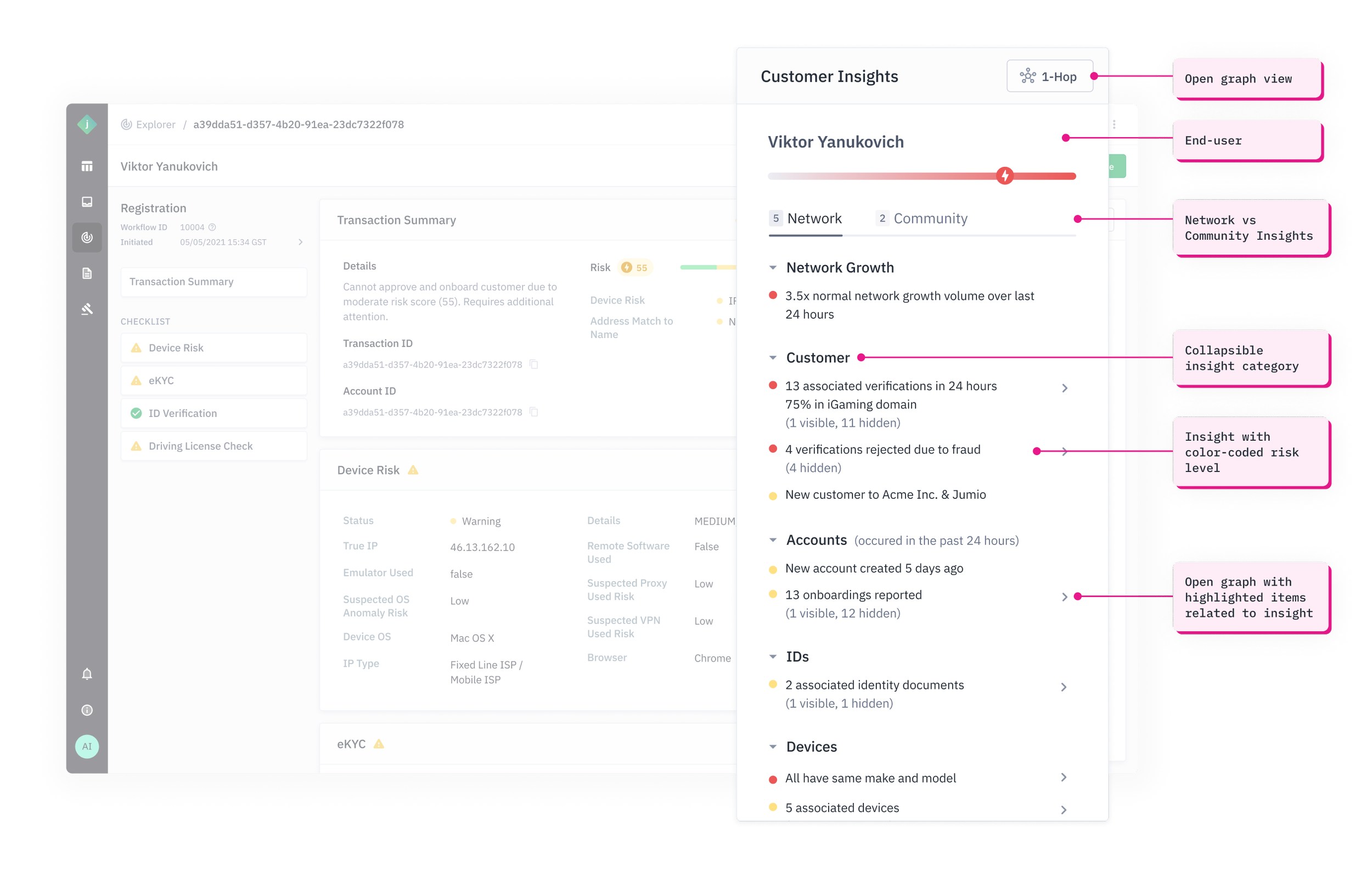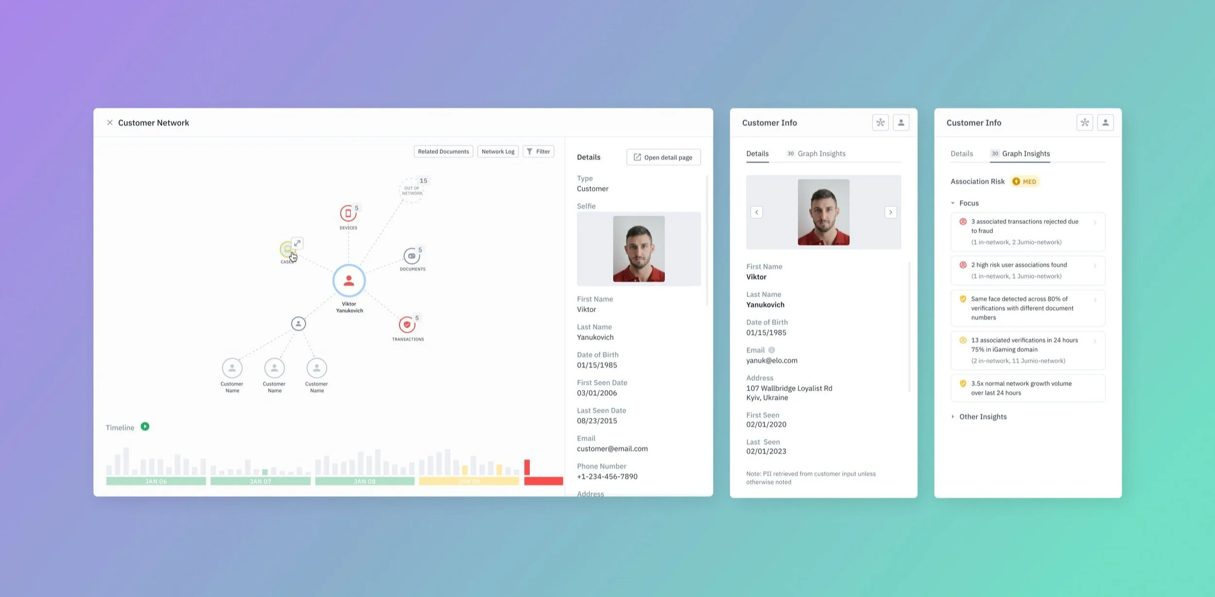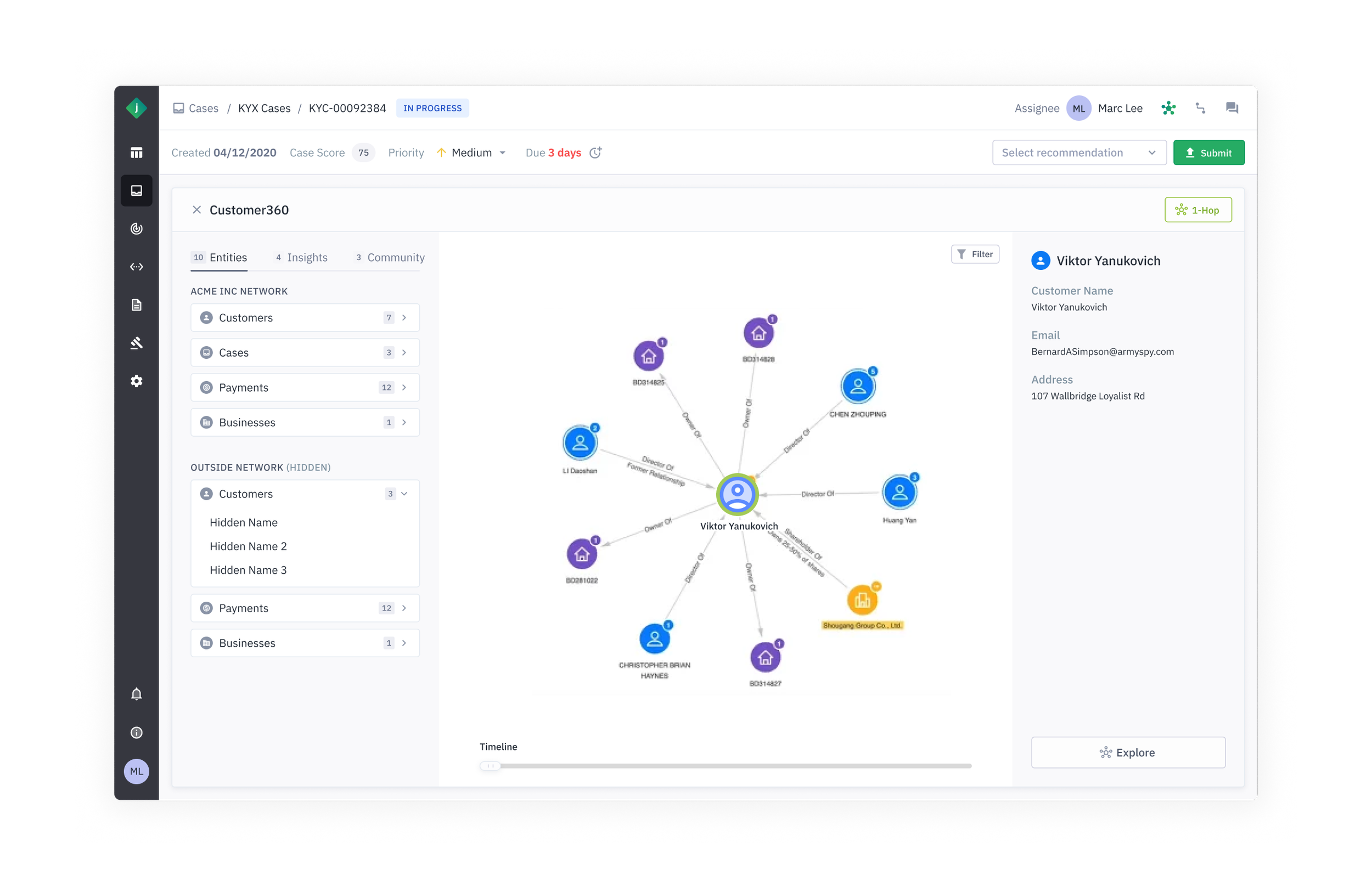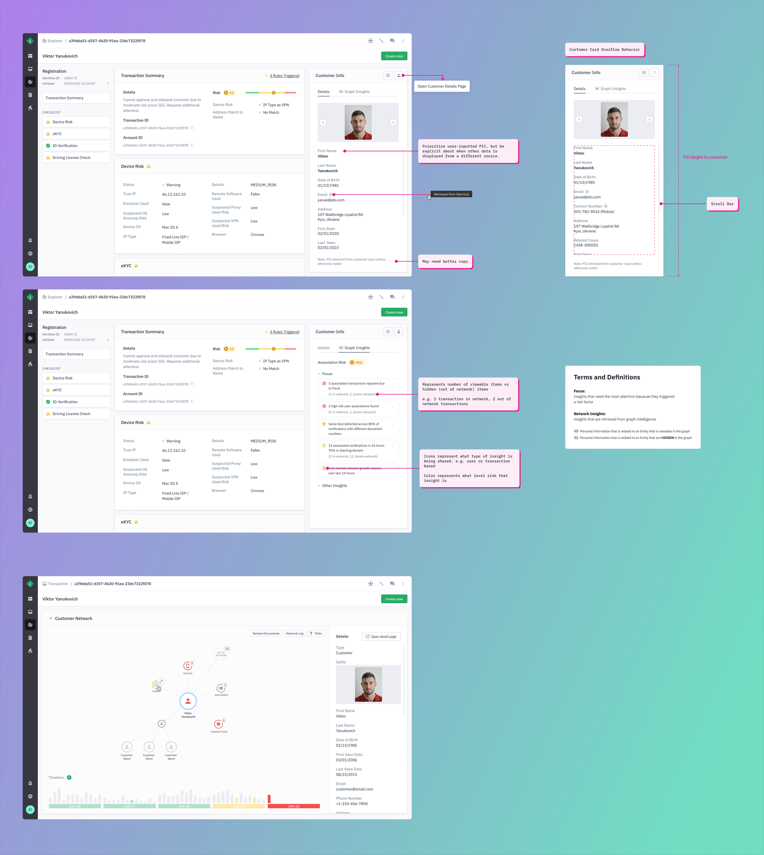 Our goal for Customer 360 is to provide a holistic view of the end-user's identity by connecting related items, potentially including data shared by other customers. Additionally, we aim to offer upfront risk insights for quicker, confident investigator decisions.
