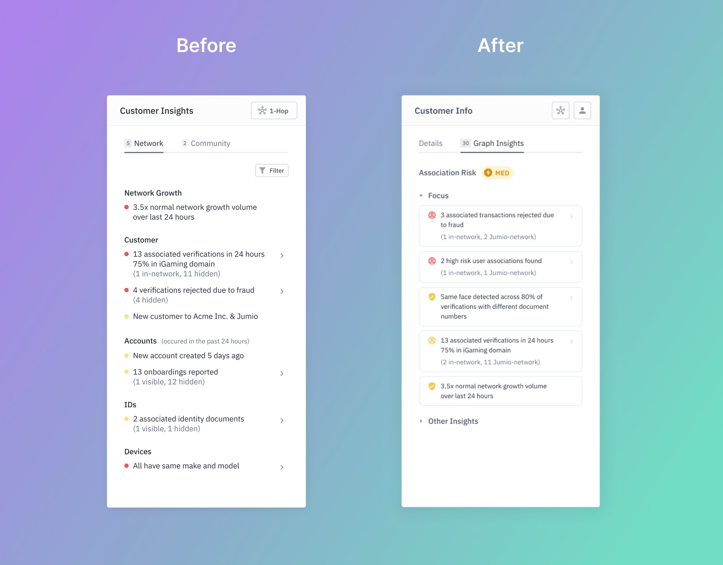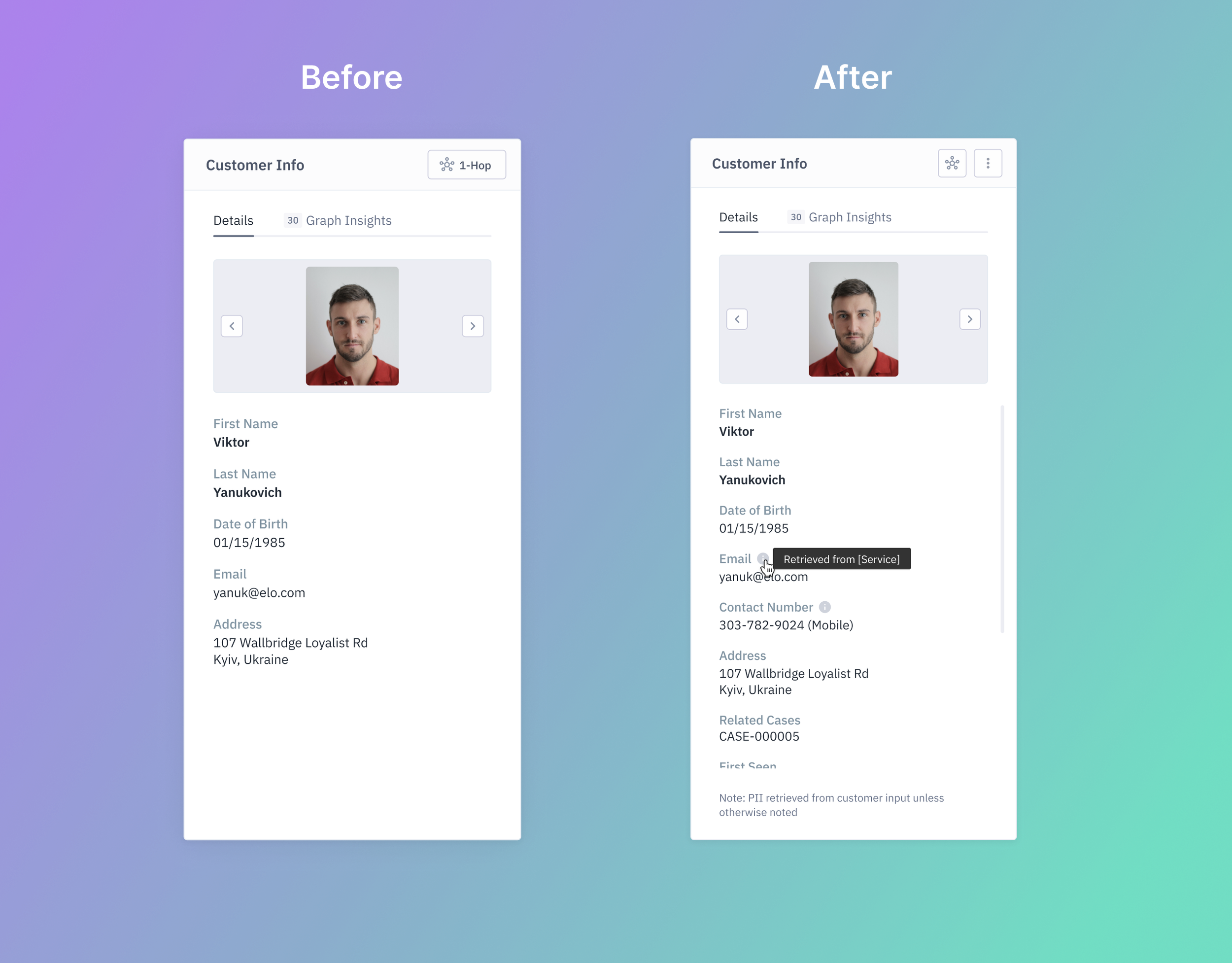 As a result, we added a note to be explicit about where the data was coming from at the bottom of the card. It was also suggested to include more information beyond their PII to get a better sense of the individual’s presence in their platform, such as past cases, first seen, last seen, and number of verifications.