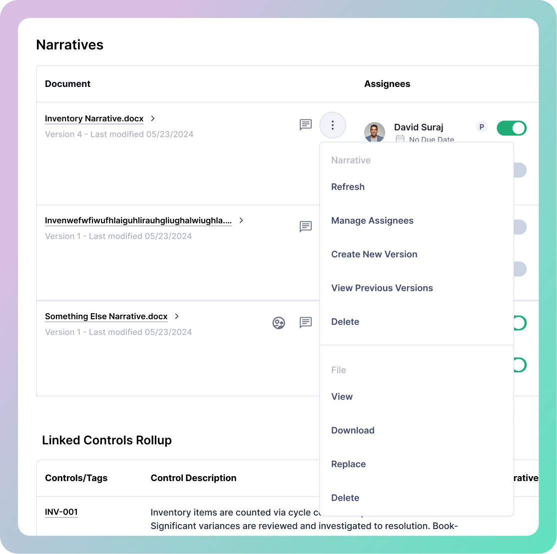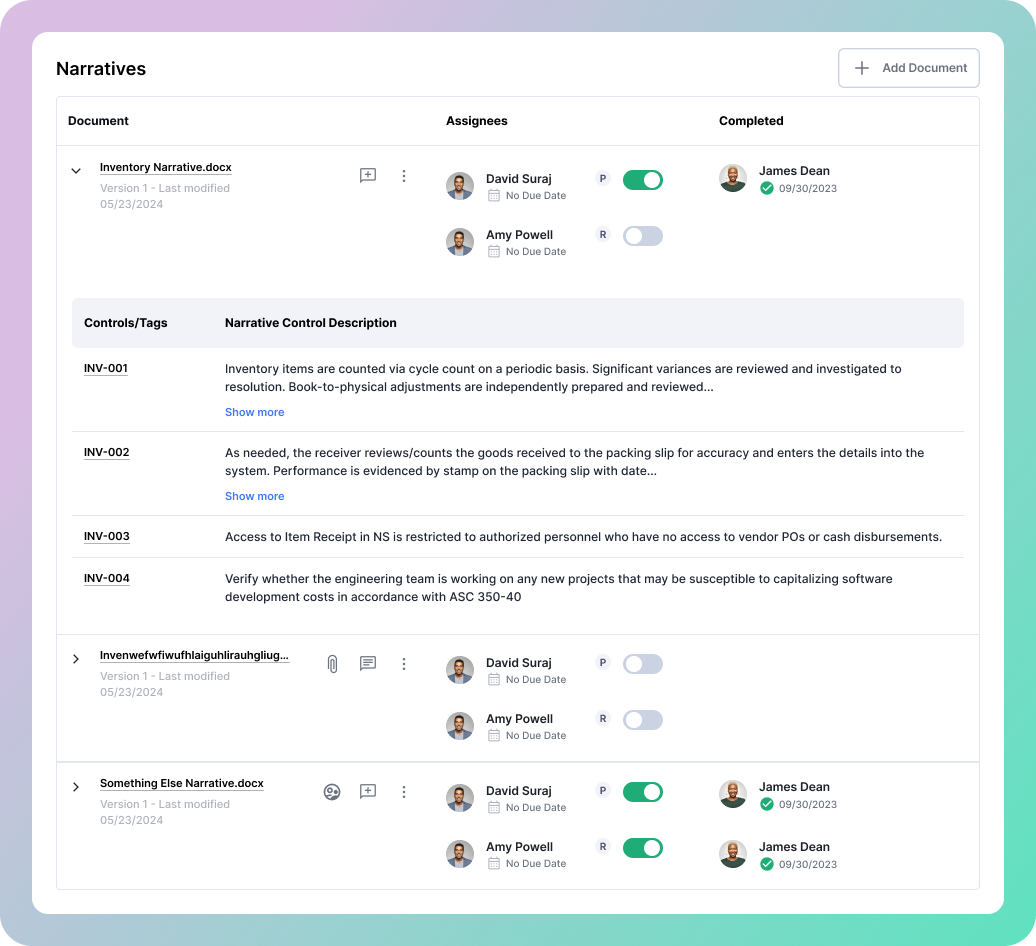 The initial focus was giving users a clear way to see all files tied to a single process without overwhelming the existing UI. Early explorations used a simple document list within the process detail page, surfacing key metadata like upload date and associated controls count at a glance.