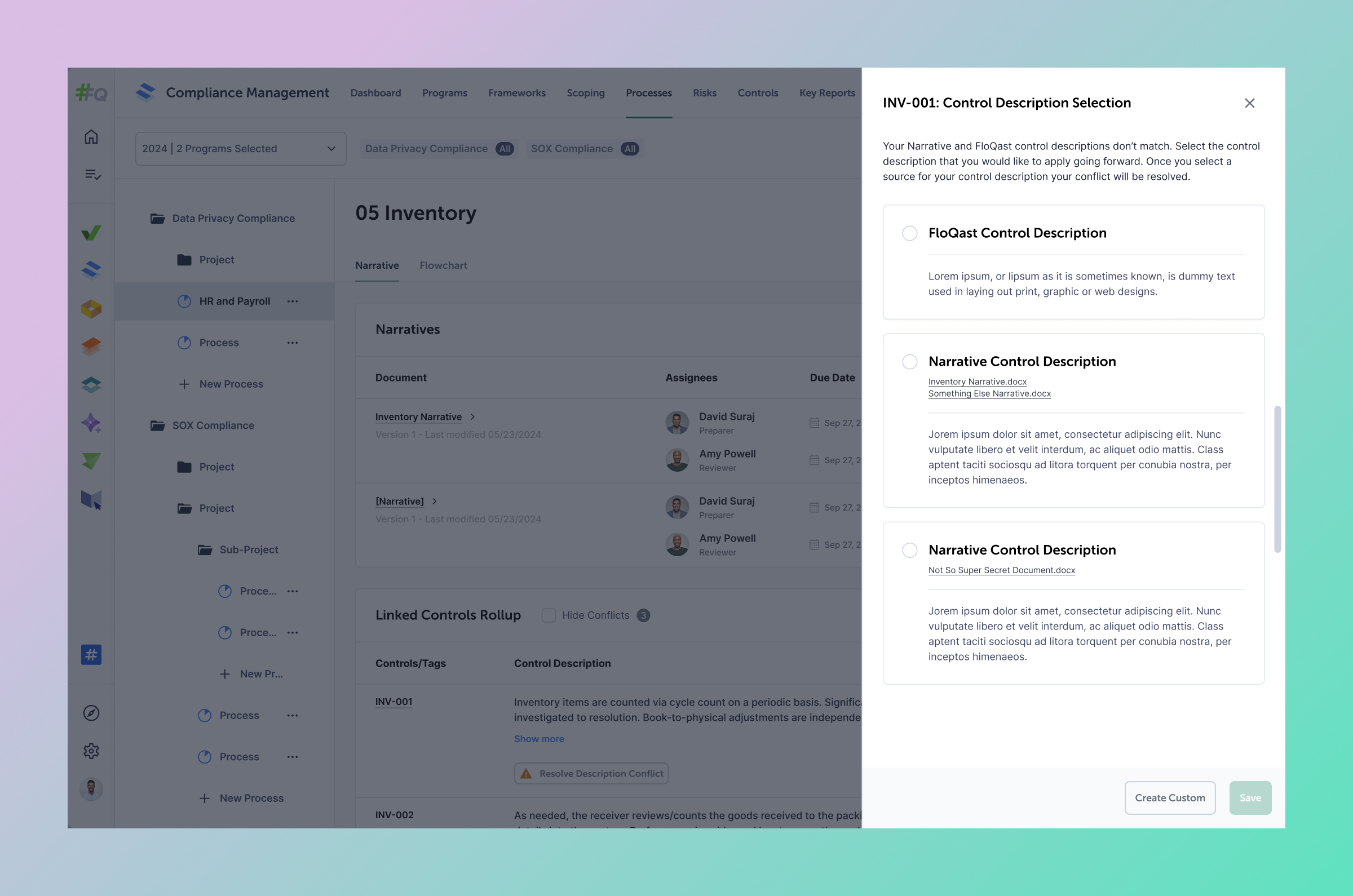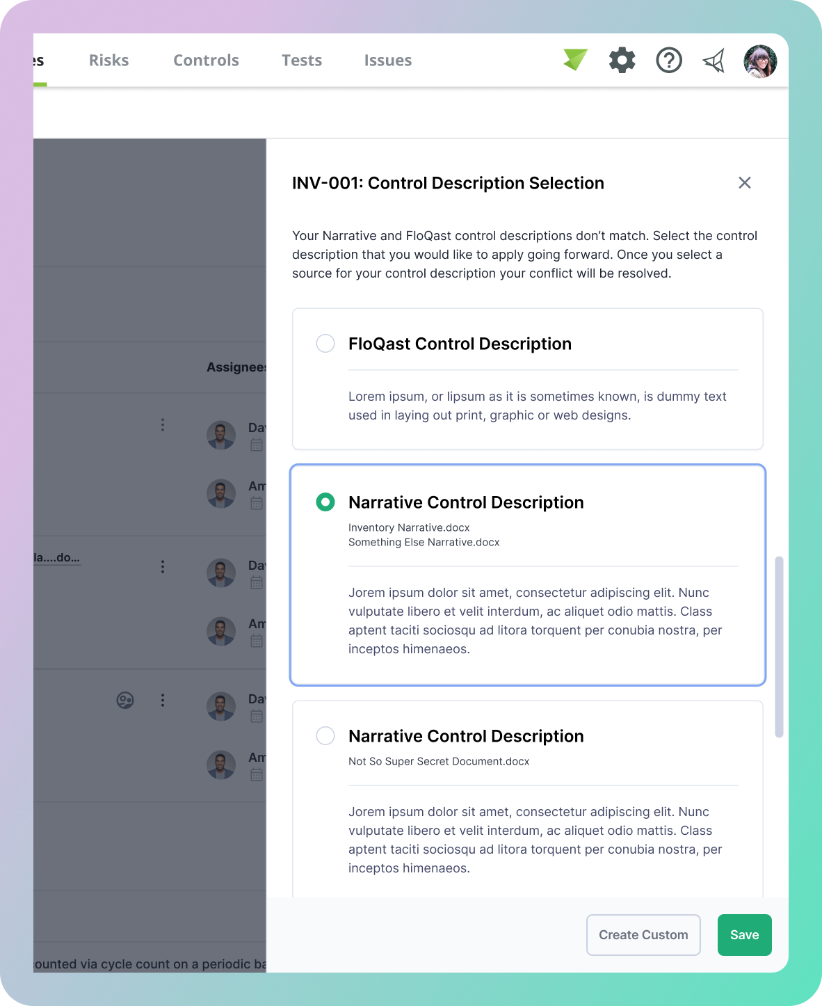 When multiple documents are parsed, the same control can appear with different descriptions across files. The first iteration surfaced these conflicts inline, presenting each version side by side so compliance managers could make a deliberate, informed choice rather than having the system decide for them.