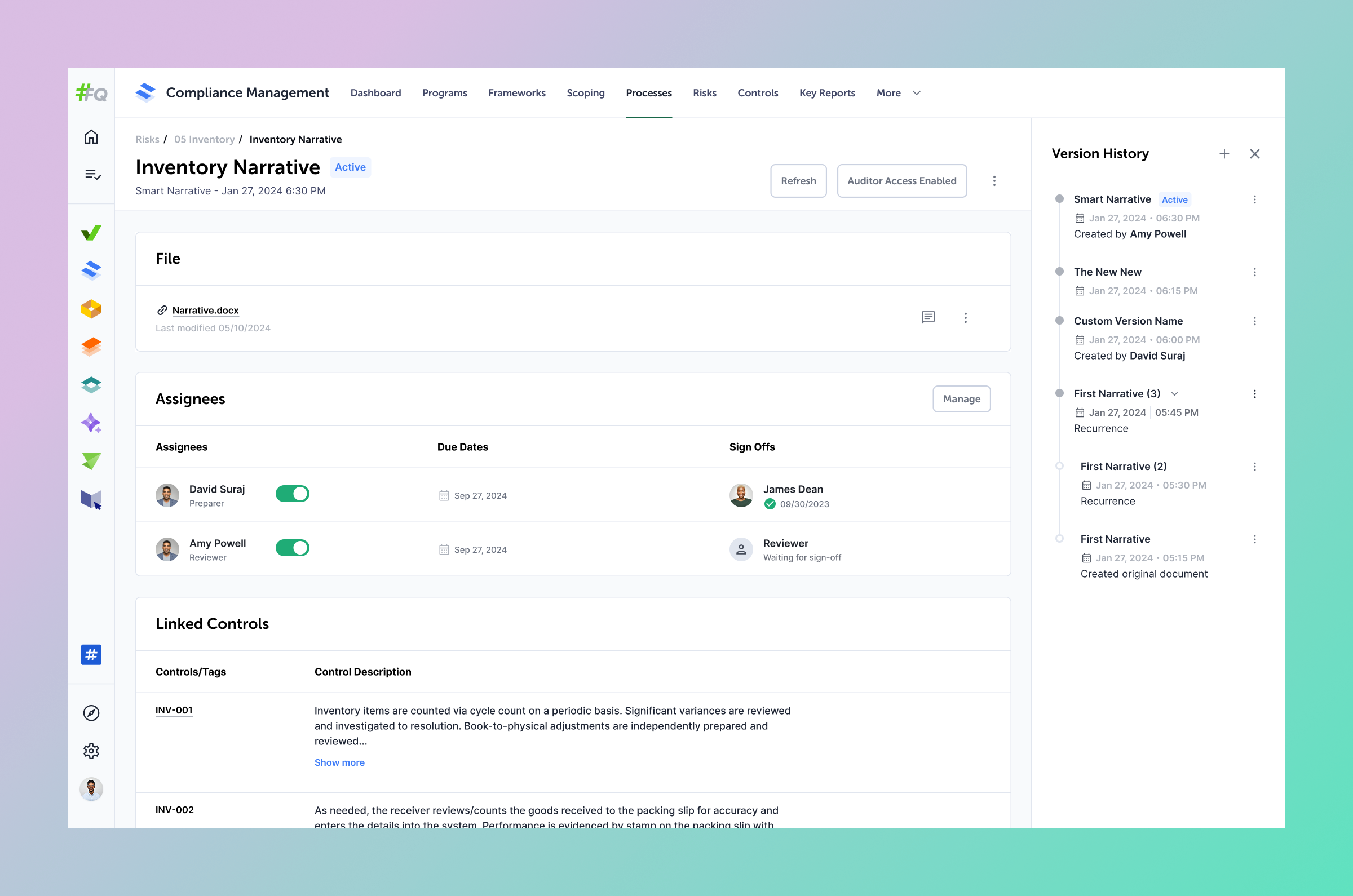 Audit trails are non-negotiable in compliance workflows. The first iteration introduced a per-document history panel logging each upload with a timestamp, uploader, and a summary of control changes — giving teams the confidence to trace any change back to its source when it matters most.